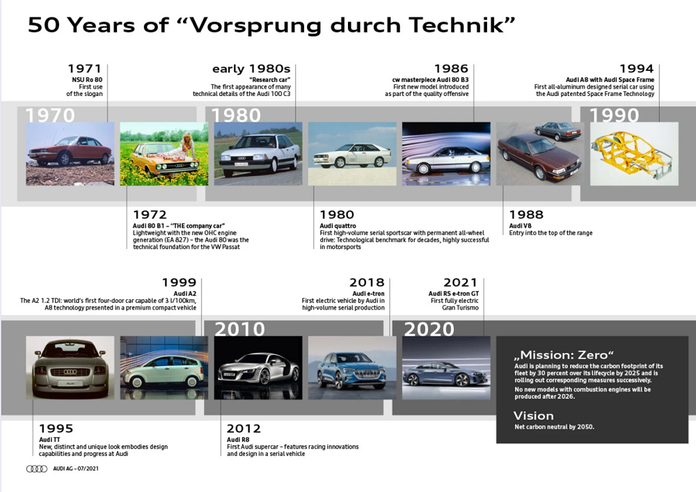 Man behøver ikke være bilinteresseret for at vide, hvem der står bag de legendariske tre ord ’’Vorsprung durch Technik’’. Sloganet hører sammen med enhver Audi reklame, og det er nu 50 år siden, det optrådte i en annonce for første gang. Audi markerer jubilæet ved at kigge tilbage på de fem årtier – men også frem.