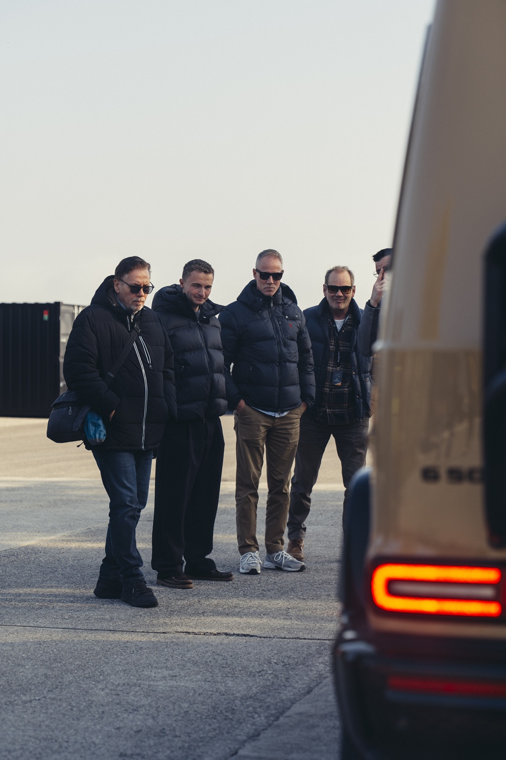Efter første øvelse er der frokost i den hangar, som Mercedes-Benz har indrettet som base, når man er på besøg. Her er lunt og dejligt, og man kan nyde synet af en indstøbt Geländewagen fra 1979 – et varigt minde fra ikonets fødsel.