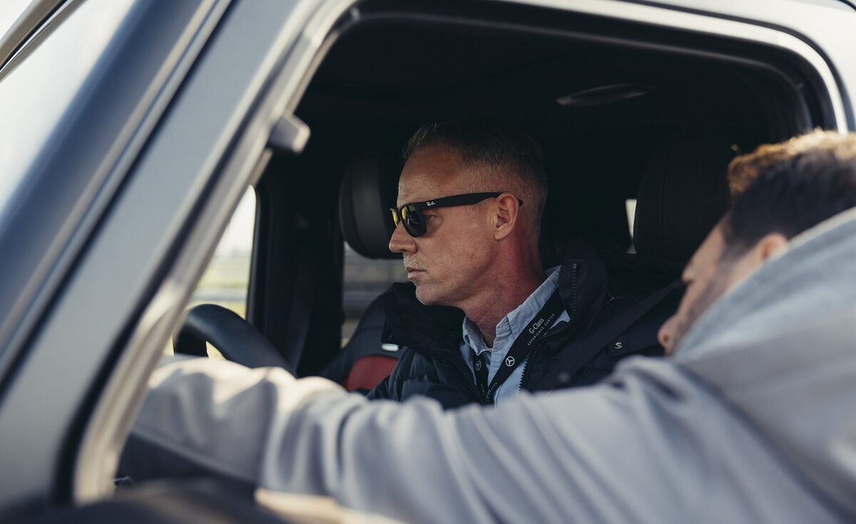 Jeg kniber mig selv i armen, da vi går hen til en stribe Mercedes-AMG G63 og egentlig bare skal vælge, hvilken farve den første ”øvelse” skal foregå i. Jeg napper en matsort og hopper ind. Jeg elsker dørenes karakteristiske klonk, når de lukkes, og de store varevognsagtige blinklys på toppen af forskærmene. Yes – nu går det løs.