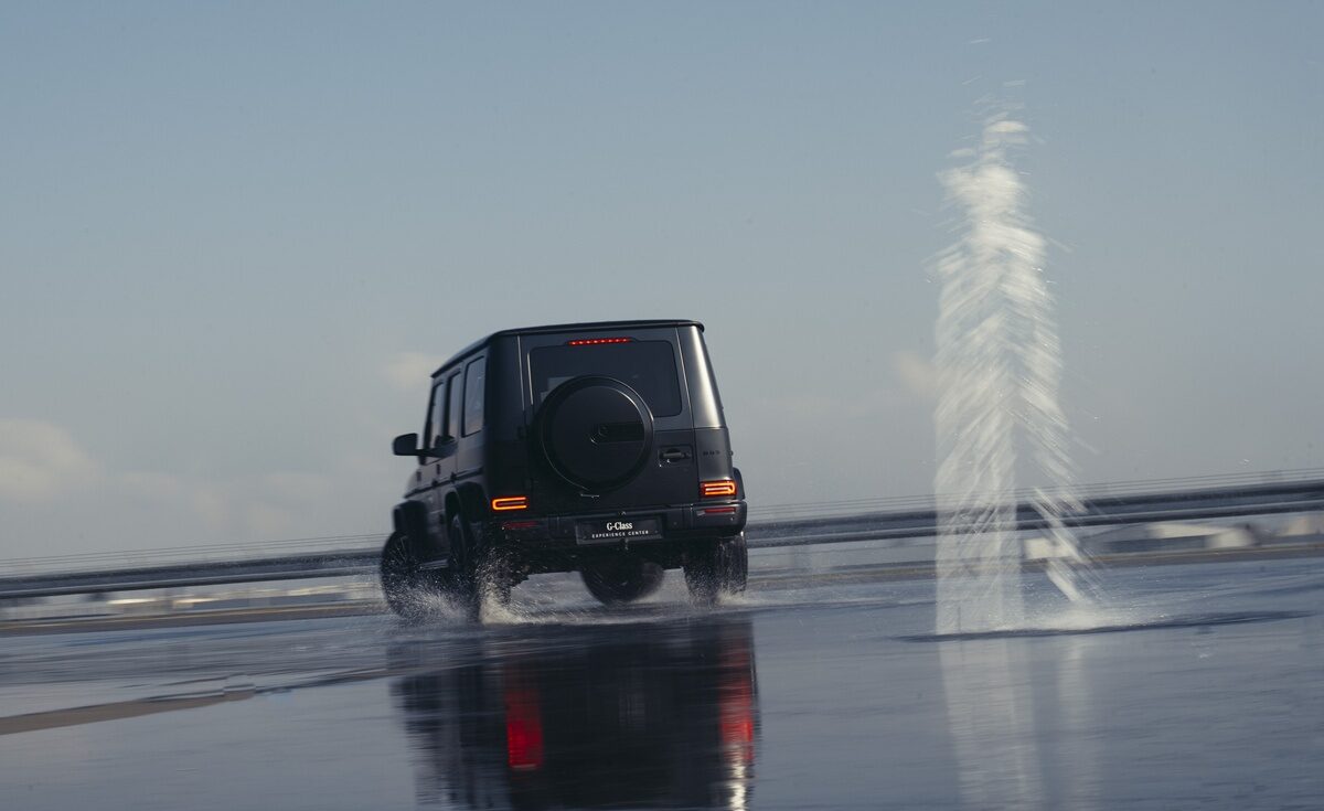 Øvelsen viser, hvor kapabel den store og tunge G-Klasse er i denne disciplin, og med V8 biturbomotor kan man ikke lade være med at give den noget gas. Vi får også mulighed for at prøve launch control – hvor bilen forvandles til en slags raket, der bringer den tunge bil op på 100 km/t på lidt over 4 sekunder.