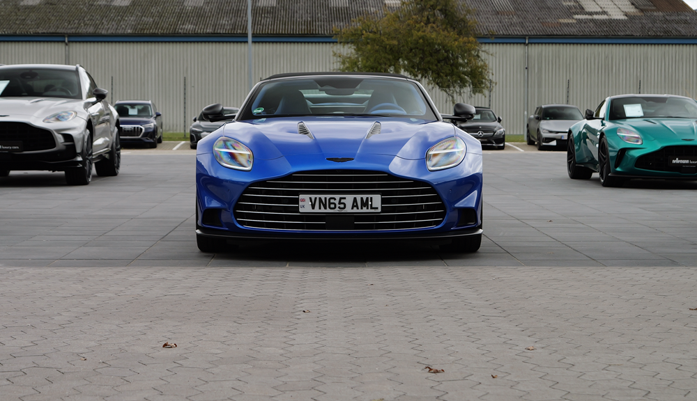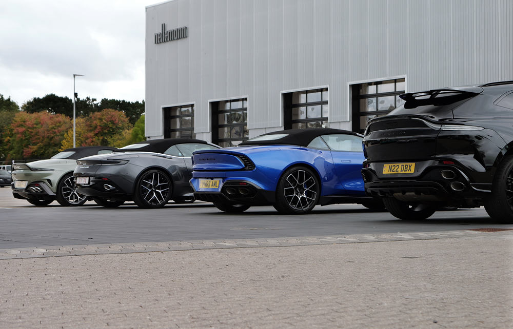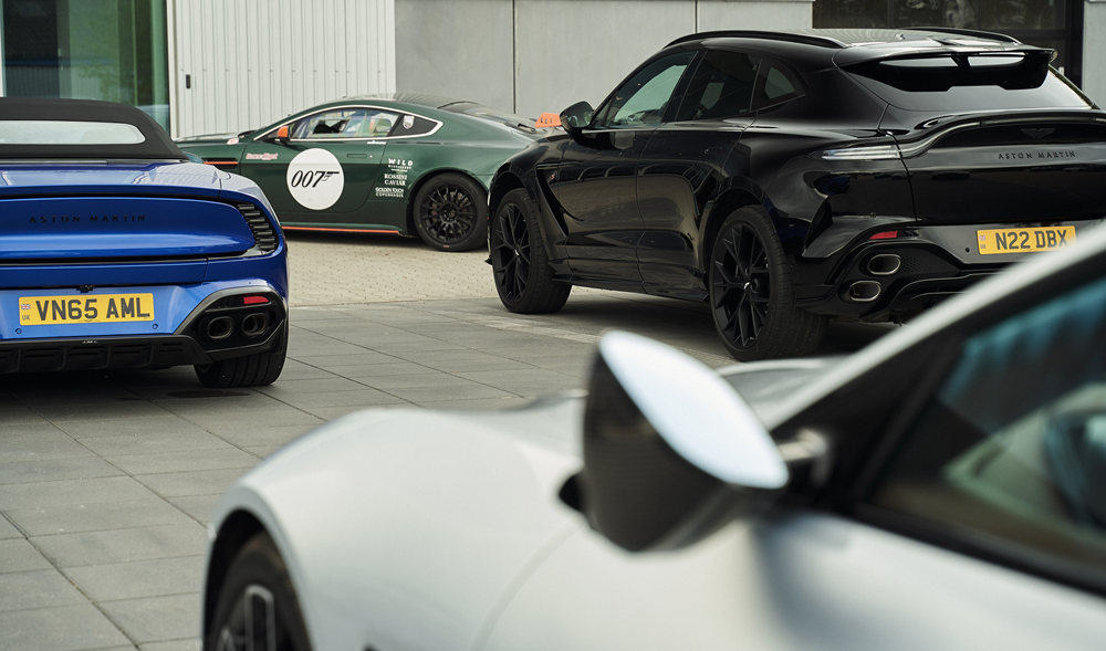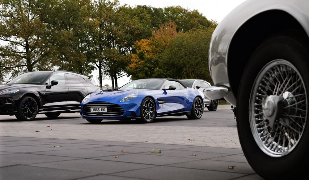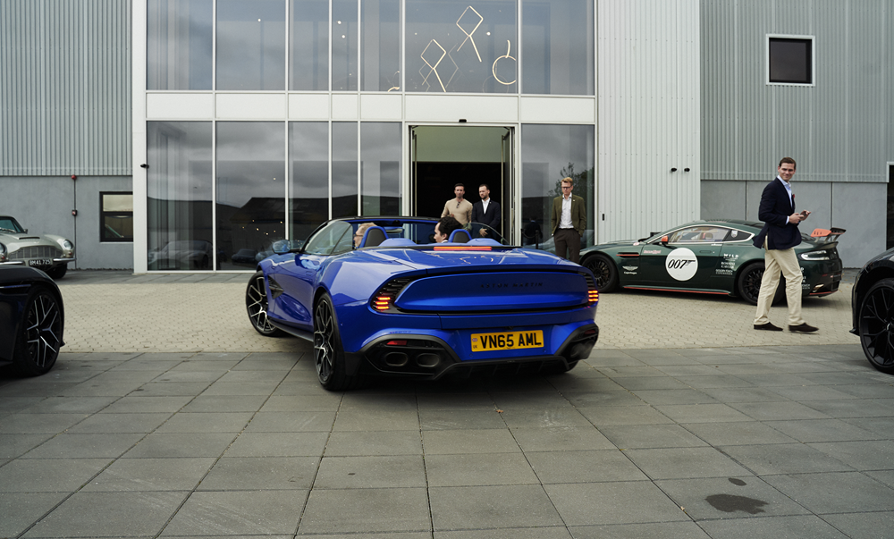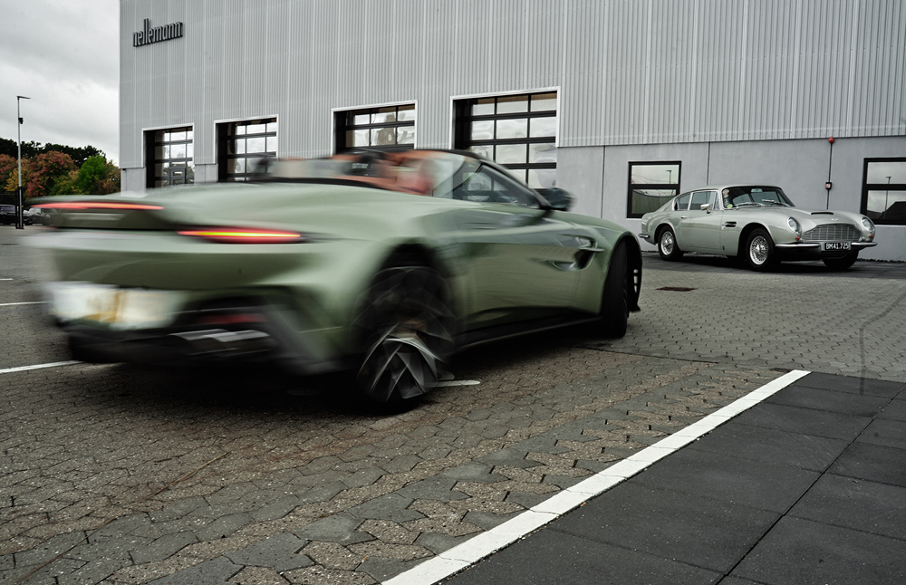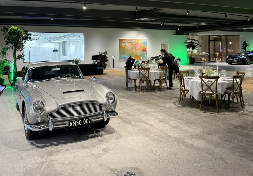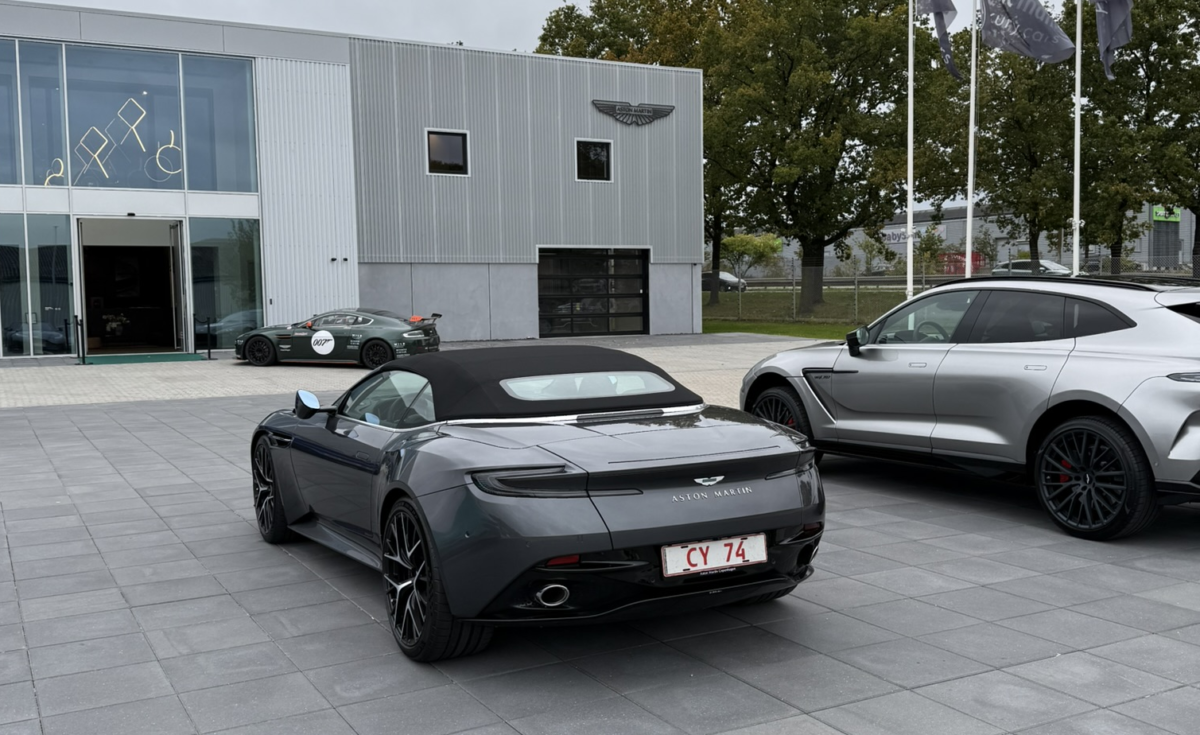 Foran bygningen står et syn, der får enhver bilelskers puls til at stige: en perlerække af Aston Martins modeller – også de helt nye. Vanquish Coupé, Vanquish Volante, DB12 Volante, Vantage Coupé, Vantage Roadster og DBX S – alle linet op på plader, klar til prøvekørsel.