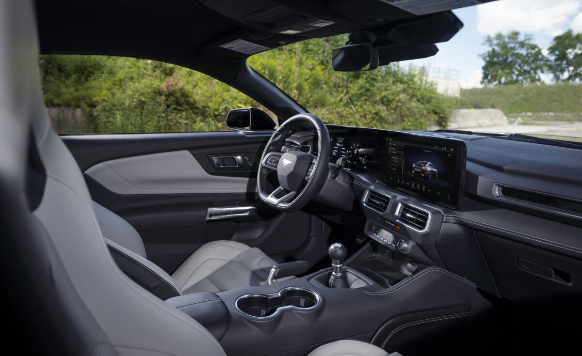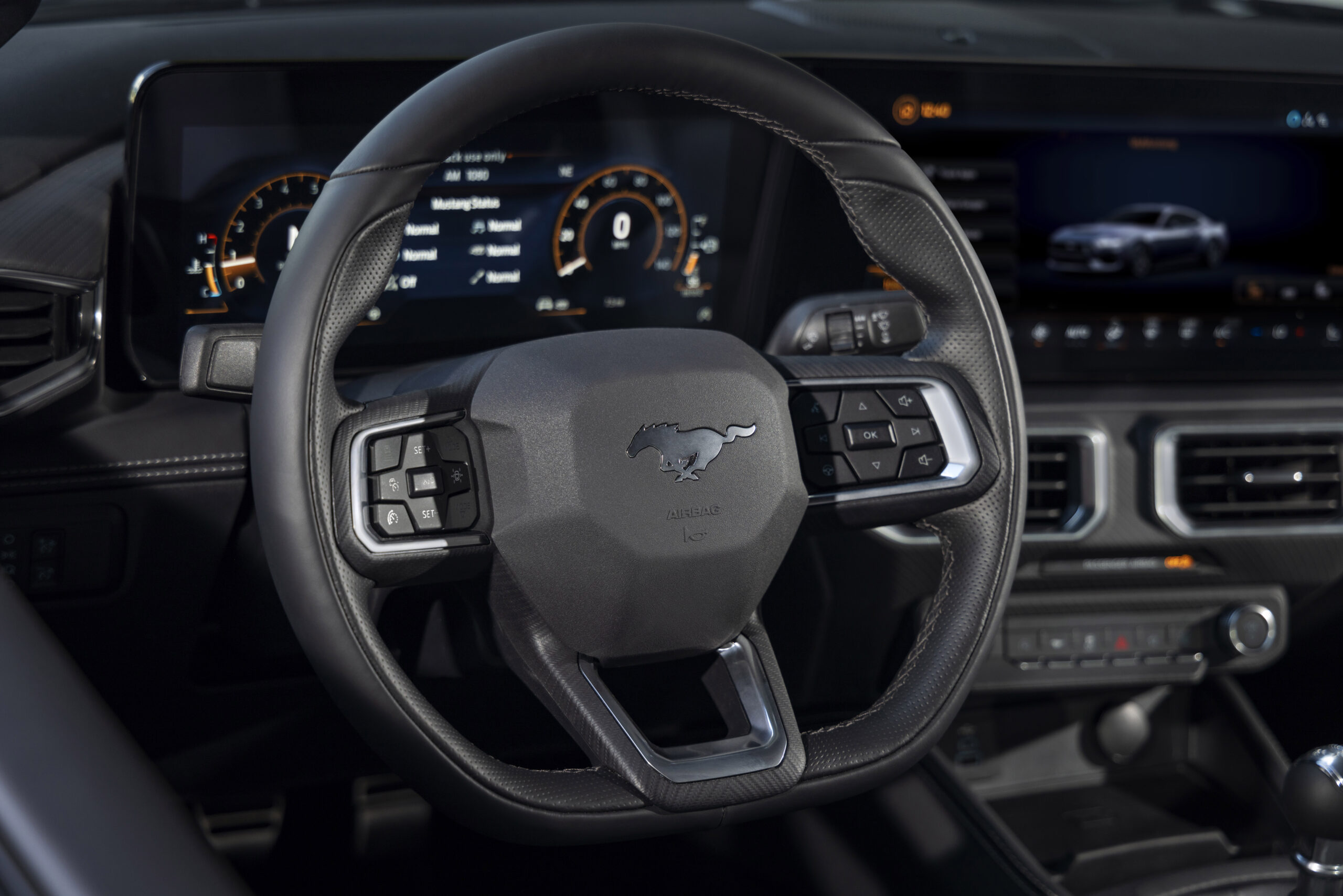 I kabinen er der som nævnt sket store sager. Mustang er gået ind i den digitale æra og har nu en stor tværgående skærm med digitalt cockpit og infotainment. Det er fuldstændig anno 2024 og systemet bag er det nyeste SYNC4 fra Fords hylder.