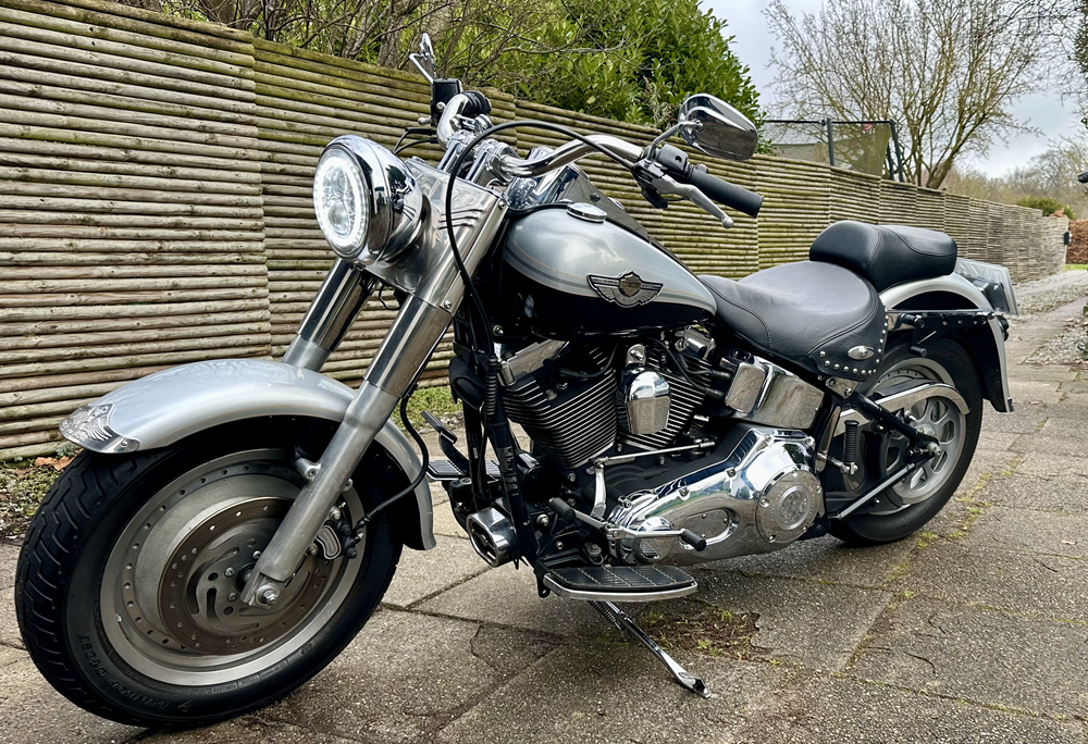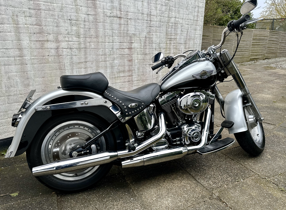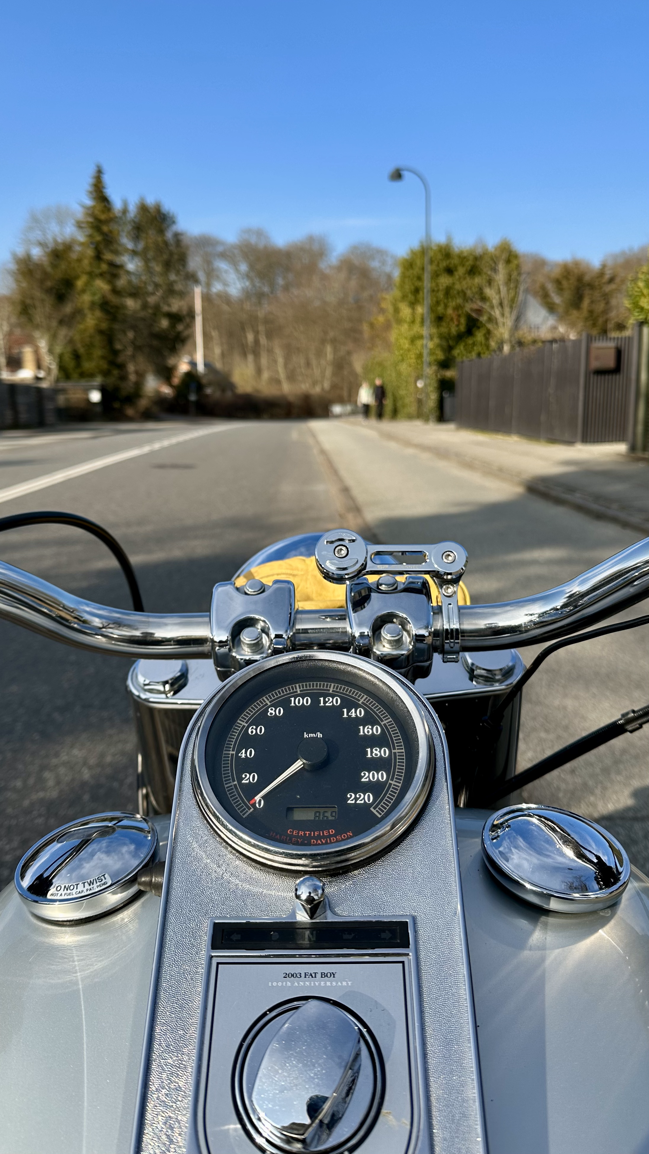I 2024 skete det endelig. Jeg underskrev købet på min første Harley – en Fat Boy fra 2003. Den helt rigtige årgang, med 100-års jubilæumsdesign, tofarvet lakering, massiv forgaffel og støbte fælge. Præcis som jeg havde ønsket mig det i over 30 år.