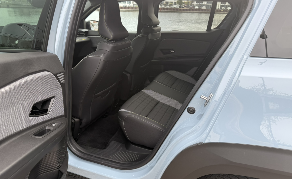 Renault 4 er 4,14 meter lang, altså 22 cm længere end Renault 5. Akselafstanden er øget med 8 cm, og det mærkes på bagsædet, hvor voksne faktisk kan sidde nogenlunde fornuftigt. Jeg er selv 187 cm og kan finde plads – ikke luksus, men acceptabelt til korte og mellemlange ture.