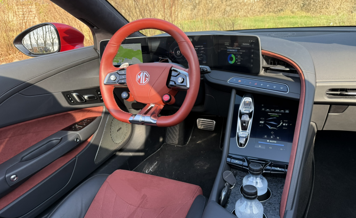MG folder alt hvad de kan rent teknologisk ud i Cyberster. Udover det tre-delte skærmsetup byder kabinen på et 8-højttalers Bose-lydanlæg, Android Auto/Apple CarPlay, stemmestyring og 360° kamera.
