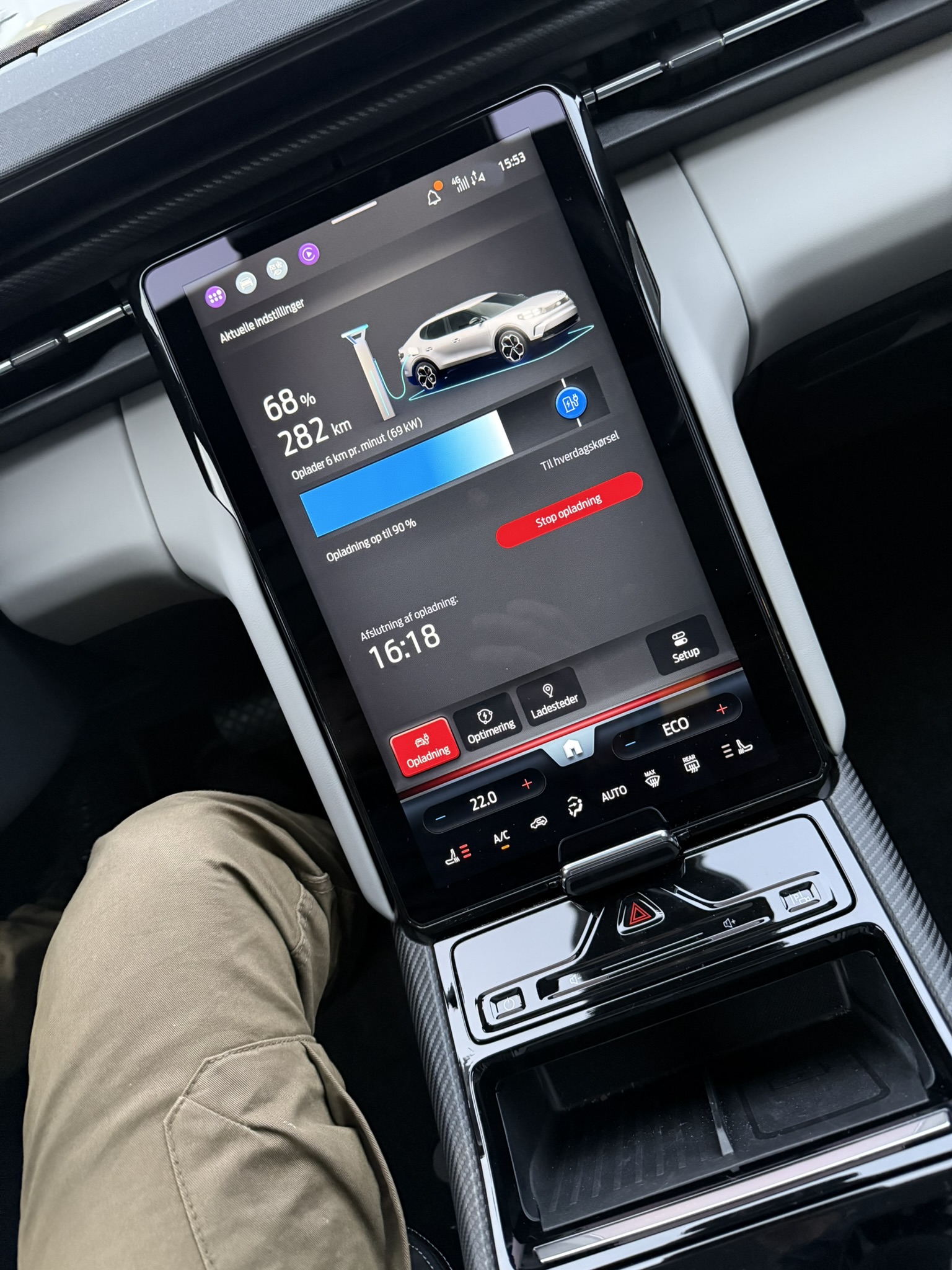 Ved AC opladning suger den strøm med 11 kW og ved hurtigladning noterer jeg mig, at den peaker omkring 100-110 kWh i testen. Under optimale forhold burde den kunne komme op på 135 kW.