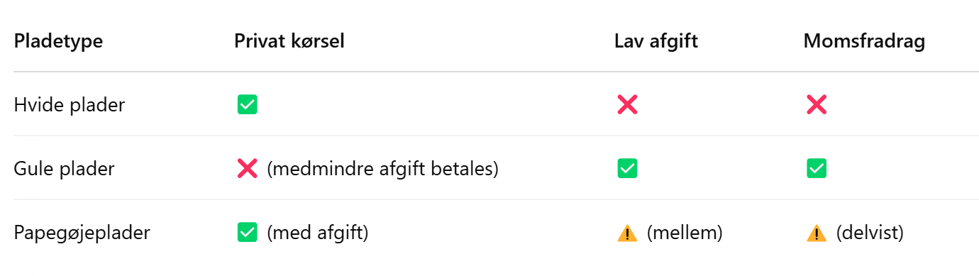 - Lavere registreringsafgift: Ofte kun 30-50 % af afgiften sammenlignet med hvide plader.