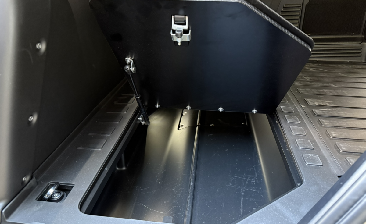 Bagsæderne tages ud og erstattes af en slidstærk bundplade, så der er god plads i varerummet bag forsæderne. Under bundpladen er der aflåselige rum til opbevaring af forskellige effekter.