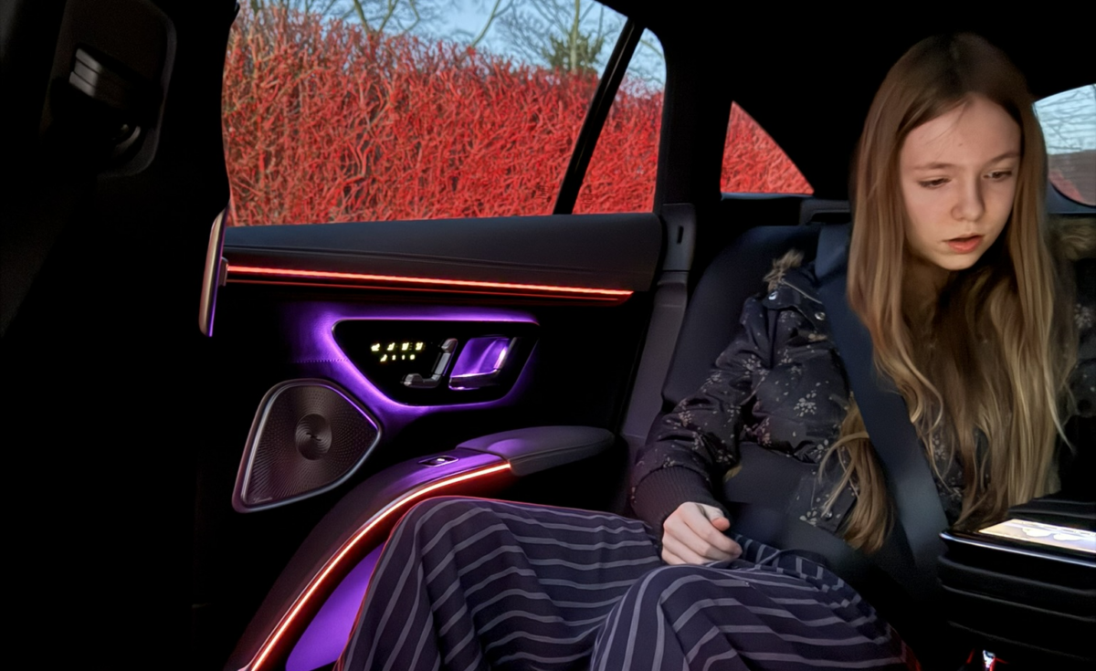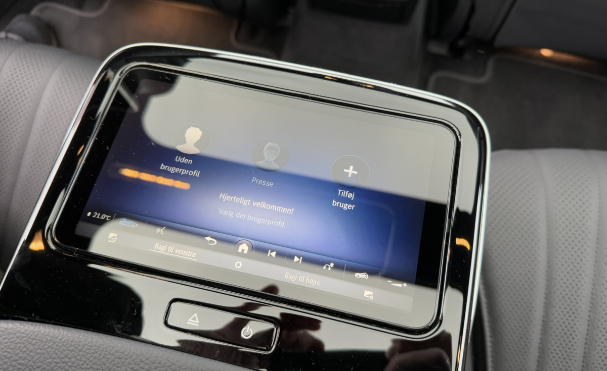 Skærme bag nakkestøtterne og i midterarmlænet giver bagsædepassagerer adgang til bilens udmærkede MBUX system.